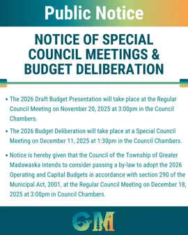 Notice is hereby given that the Council of the Township of Greater Madawaska intends to consider passing a by-law to adopt the 2026 Operating and Capital Budgets in accordance with section 290 of the Municipal Act, 2001, at the Regular Council Meeting on December 18, 2025 at 3:00pm in Council Chambers.