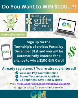 Sign up today for the Township’s eServices Portal and automatically be entered for a chance to win a $100 Gift Card!