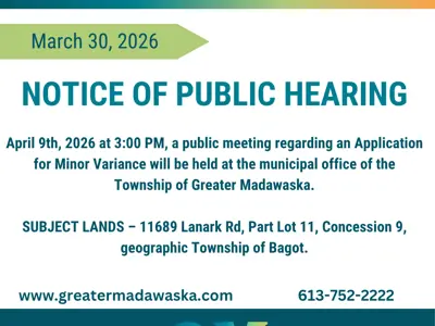 NOTICE OF PUBLIC HEARING: April 9th, 2026 at 3:00 PM, a public meeting regarding an Application for Minor Variance will be held at the municipal office of the Township of Greater Madawaska.