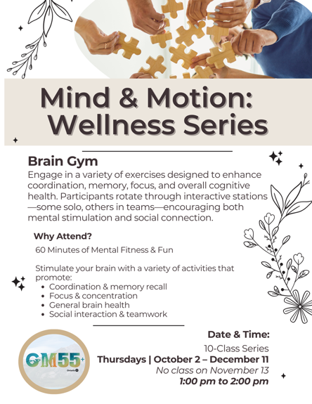 Boost your brain and body with our 10-week Wellness Program featuring two unique classes that support cognitive and physical health in a lively, social atmosphere. Choose to register for one or both sessions and take a step toward feeling stronger, sharper, and more connected.